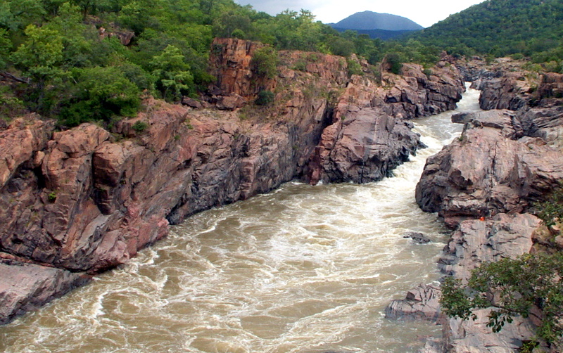 At Mekedatu, the river Kaveri runs through a deep, narrow ravine of hard granite rock. The river, which is more than 150 meters wide at the confluence at Sangam flows through the hardly 10 meter wide gorge at Mekedatu.