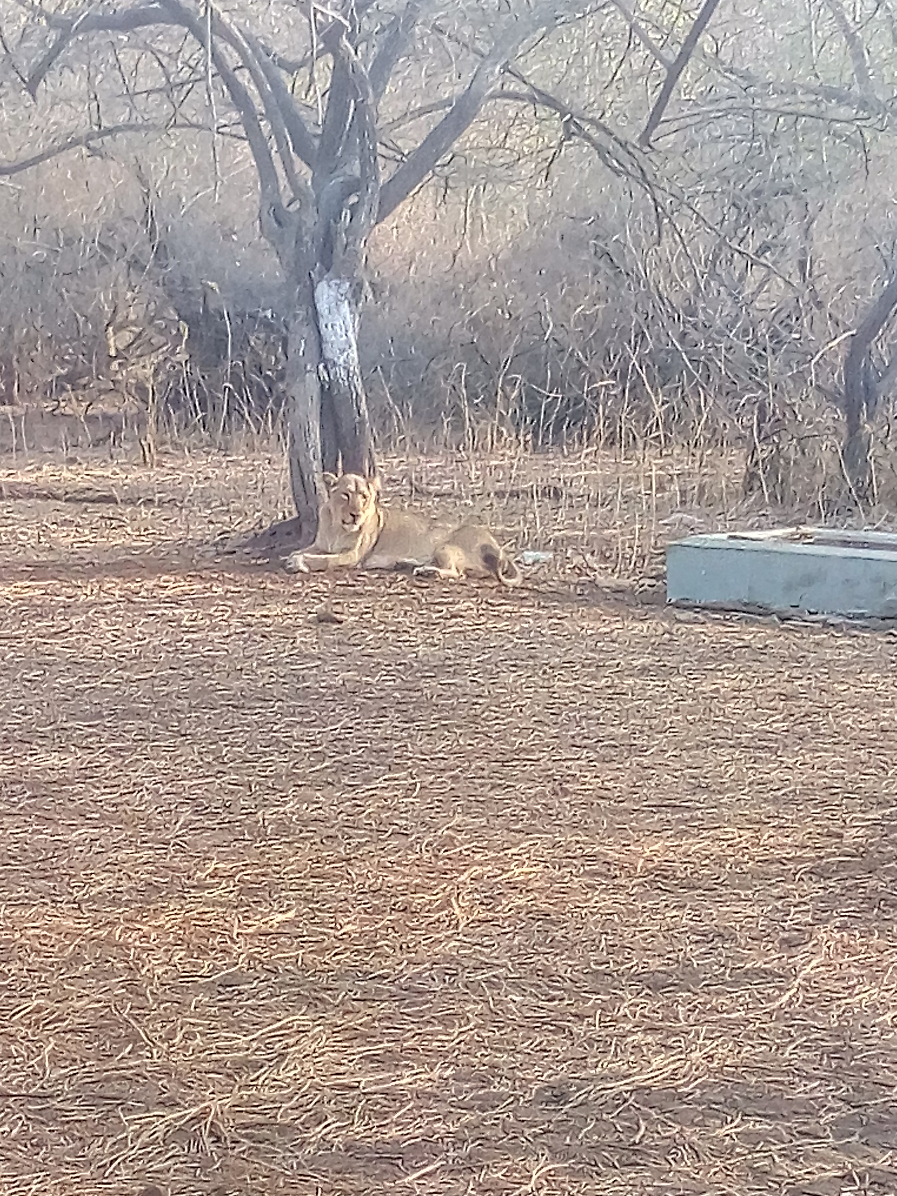I had 4 safari permits spanning 15th and 16th. 2 of them were on the 15th, one being at 6 – 9 A.M. safari in the morning. The reporting time was 5.30 A.M. at the Sasan Gir Reception Centre. I am a person who normally gets up around 8 A.M. but I was practicing getting up early for the last 2 weeks, so this was no problem. I set an alarm for 4.30 A.M. but managed to get up at 4.27 A.M. To my surprise, while freshening up in my room, I heard a peacock calling loudly somewhere close by. This went on for some time. Turns out, I did not need an artificial alarm. But the best was yet to come. At around 4.45 A.M., there was a steady lion roaring also audible from my room. It seemed quite nearby, so I opened the curtains but didn't see anything. This happened 4-5 times straight before ceasing. I had actually been told that there are lions who visit an area not far from the back of my room sometimes. But all this came as a pleasant surprise.