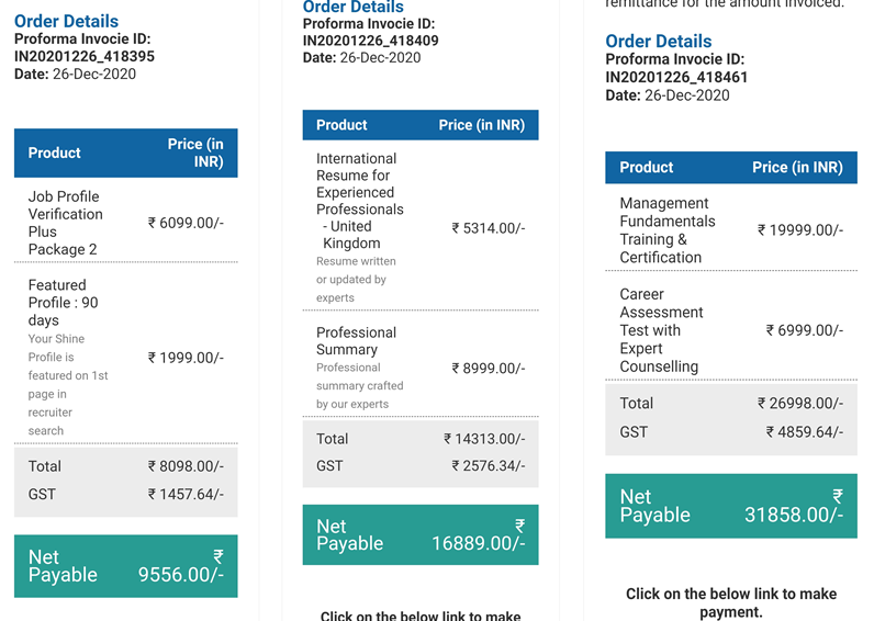 As soon as I did my payment, I received another email from them with another payment link of Rs16889/-, on the name of the International resume for Experienced Professional.