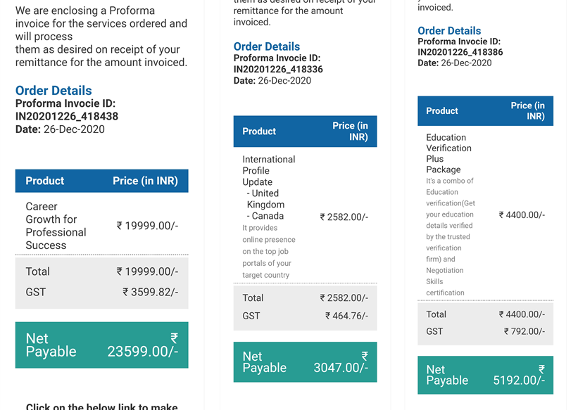 Later that day, 26/12/2020, I received calls from number+91-124-609xxxx. There were many calls one after the other. The person on call was Mr. Jatin, who represented himself as my coordinator for everything from that point on. He told me that to make my job application at par with international standards I need to get the Education verified. I asked about the charges for this. At first, he refused to tell any charges saying that he is not from the finance department and it’s not his concern. When I said that I need to know the total cost before moving any further, he put my phone on hold for a few seconds saying that he will tell after confirming from the finance department. Then when he came back he said the charges will be Rs.5192/-. I said ok, then he sent me an email containing the link for the payment. I paid for it.