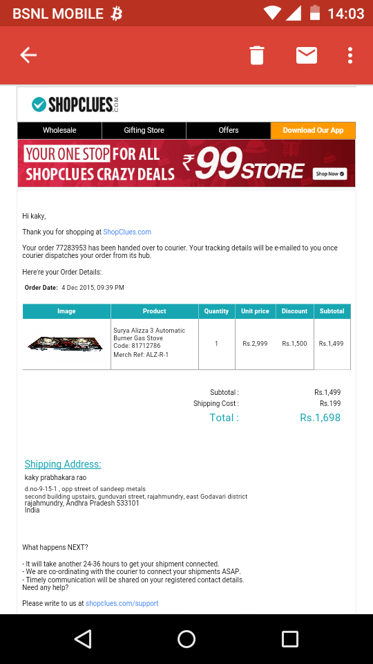 My second order is a gas stove which is automated.I received the gas stove after 15 days of order that too in a fully broken condition.I applied for return and I got my amount refund after 2 months of continuous follow up. By this we can understand that the customer service is horrible. The product is not good and not as mentioned in the description. The delivery time is long and for one order the delivery man refused to bring the product till our house, he requested us to come to the office and take the product. By all the bad experiences I had from this website I decided not to use this app anymore . So I uninstalled it and I decided to never rely on it anymore
