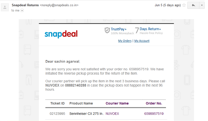 The reverse pickup was arranged and the actual goods ordered were to be delivered in 5 working days. Most surprising part is today(10th June 2015) when the delivery package were opened there were no goods at all. In fact to humiliate us further there were scrap which was packed and couriered to us.