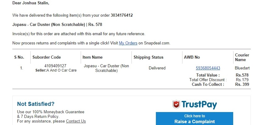 My order was Placed on 6th October in the Diwali Bumper sale and it was a Jopasu - Car Duster (Non Scratchable) costing Rs. 299( Refer screenshot image 1). And while delivery, they've increased the price to Rs. 399(Refer screenshot image 2)