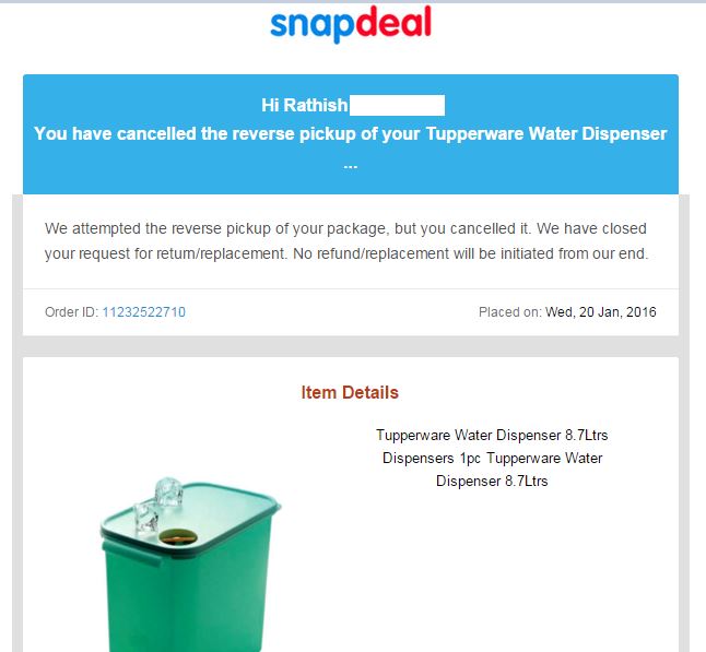 Now, why did you send me such a email when I never requested snapdel for cancelling the order replacement? why should I cancel it when I have a faulty product at my house, completly packed and labelled as adviced by snapdeal's retun instructions?