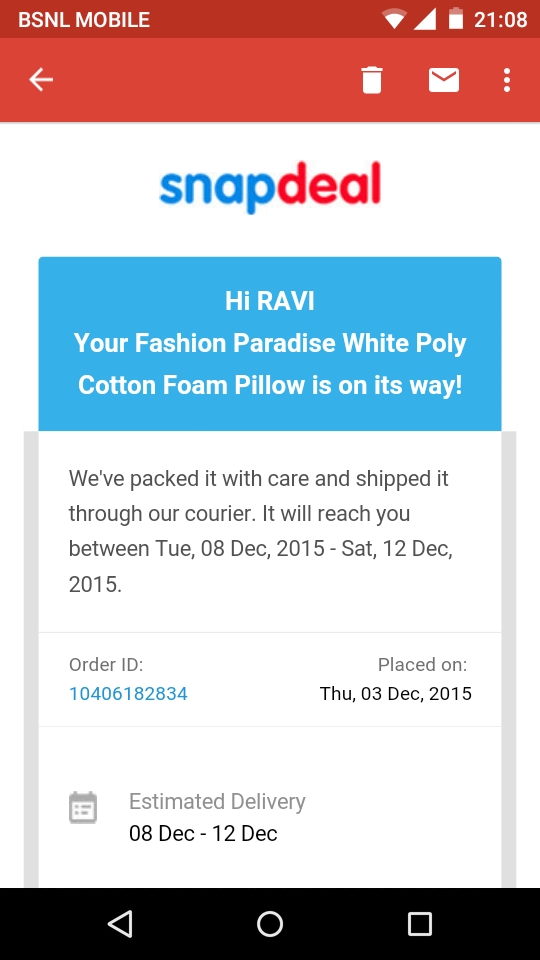 I ordereded for white foam pillow but I got a pillow which is stuffed with cardboard material .I bought it for a price of RS.450 by reading the specifications. But the pillow delivered to me did not match any of the specifications. The return taking is also very late as snapdeal has given return taking duty to private courier services. My friends also are there victims of snapdeal . They told me that they bought products thinking that branded products are coming for a low price but when they received the products it can be easily known that they are tampered products with fake brand. The app and the website are maintained properly but when it comes to reliability we cannot rely on the products as they will not be according to our specifications. Customer service is good as they responded very quickly and politely to my return and refund request. I got back the refund but I lot my, precious time because of this website