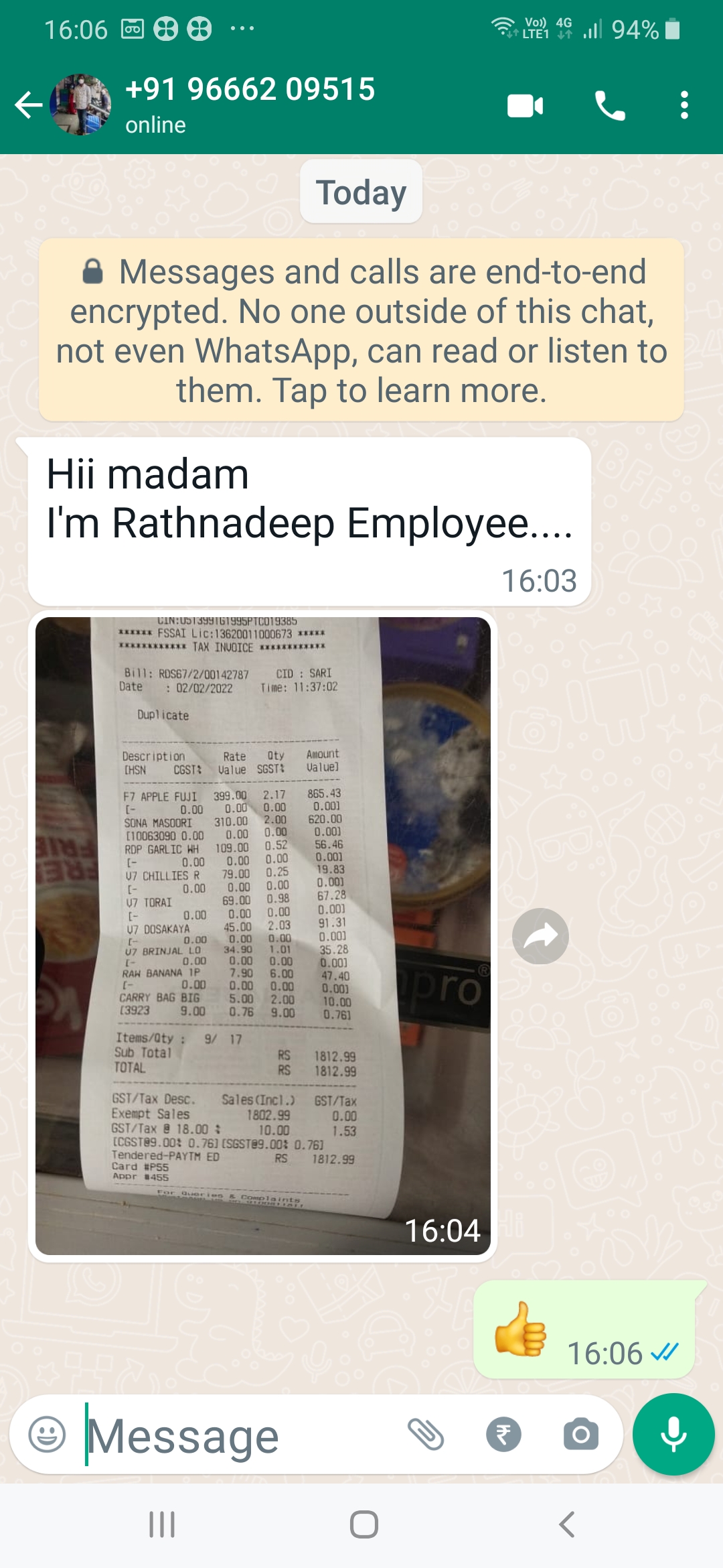 Finally, spent many hours of my time gathering all details of the order & waiting to get a copy of the actual bill (paid by Mr. Sheikh) from Ratnadeep Supermarket.