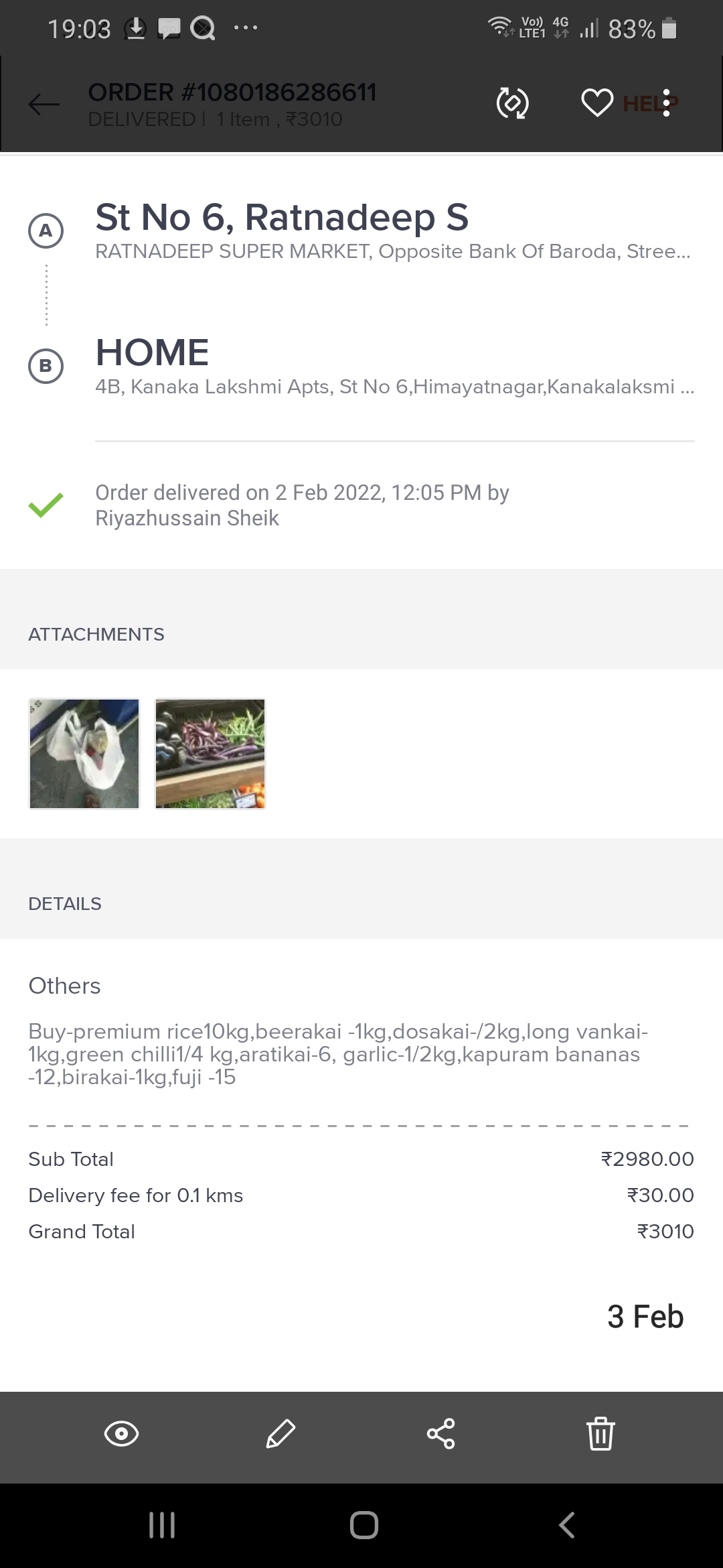 Feb 2nd, the order was placed from Ratnadeep Supermarket. Swiggy genie delivery exec Mr. Riyazhussain sheikh charged me Rs.3010 & wanted me to transfer it to his Goole Pay a/c. But for safety reasons, I paid through Swiggy. 15 minutes later he called me to check the brand of apples that I want him to buy.