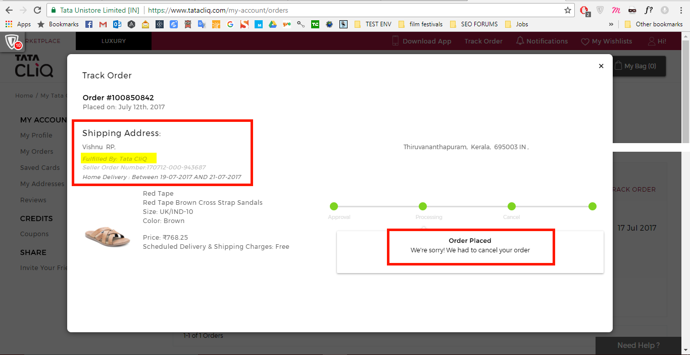 On Monday i.e, July 17th 2017, morning, I checked the website to Track the order and was shocked to see that the seller have cancelled my order even without letting me know about it.