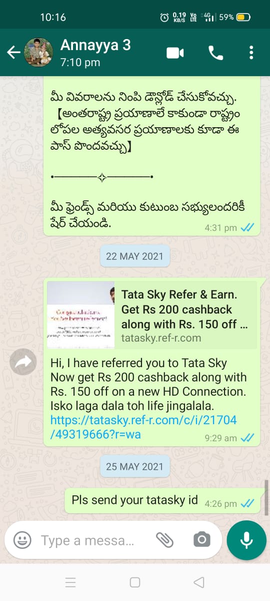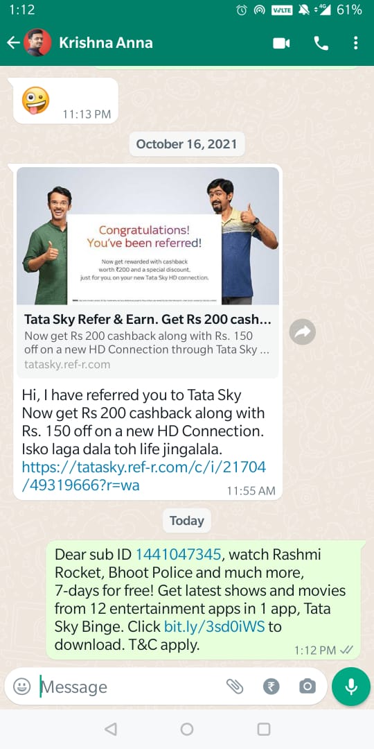 Few days ago I referred my friend through whatsapp. He got a cal from TataSky care. and installed in one day. But I did not get any referral amount. I called customer care many times. They said it was not in their records. I dont know where they goy my friend number. may be they dreamed my friend number.How do the know my friend number . how he received from Tatasky.I had referred two of my friends. one ref on June21, second one on Oct21.Pls check the photos attached.May be this the smart way cheating Customers. I have decided to terminate mat TataSky dth.Friends dont get cheated with tatasky over Smart offers.