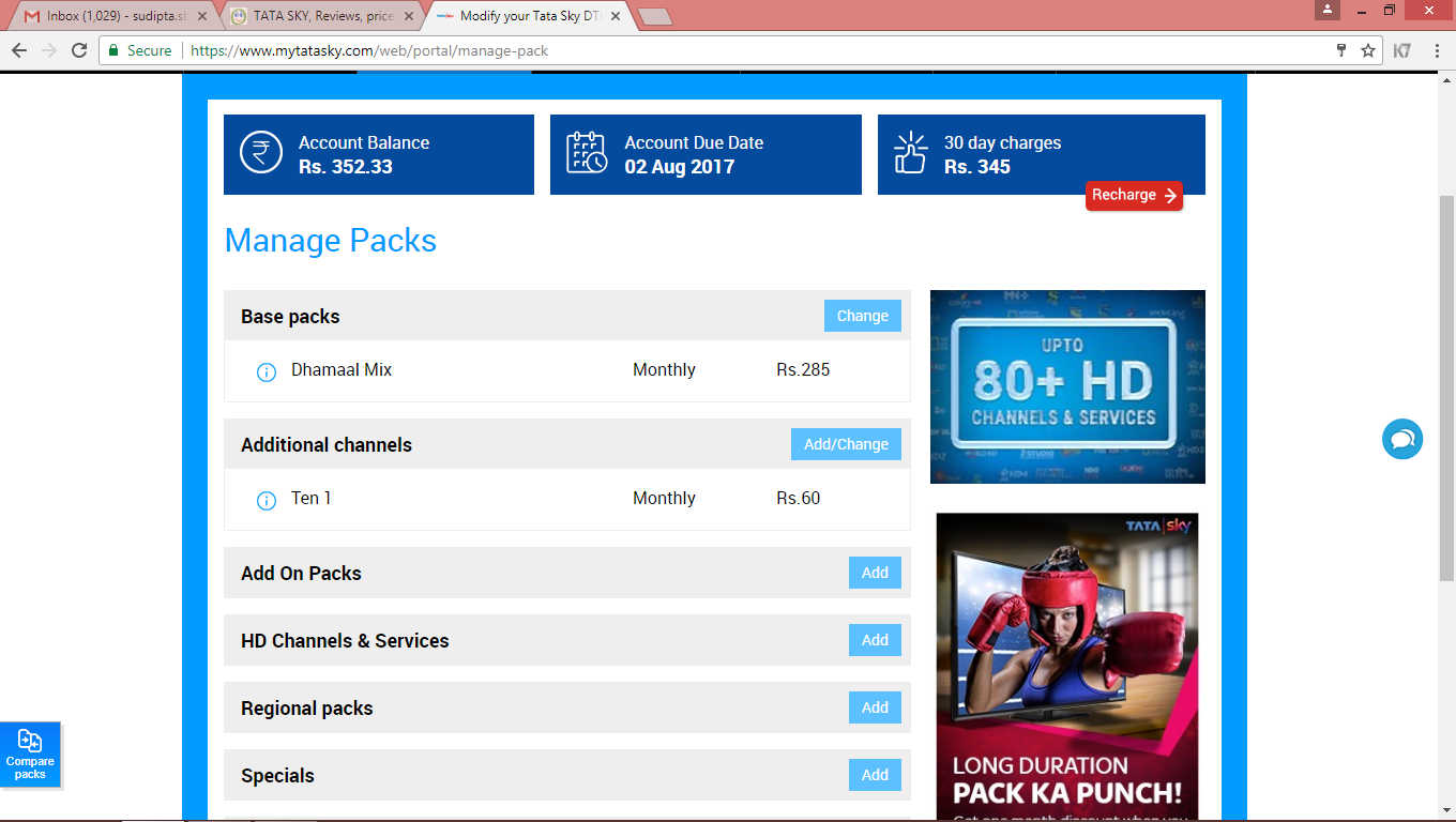 I a'm currently using tata sky sd services and subscribed to dhamaal mix pack along with ten sports. The picture quality of tata sky is good but is easily looses signal due to rain. And if compared to dish tv, the charges of tata sky are higher. My current pack are dhamaal mix pack which provides 190 SD channels along with two regional packs and costs me Rs 285 per month and I have to pay Rs 60 for ten sports.