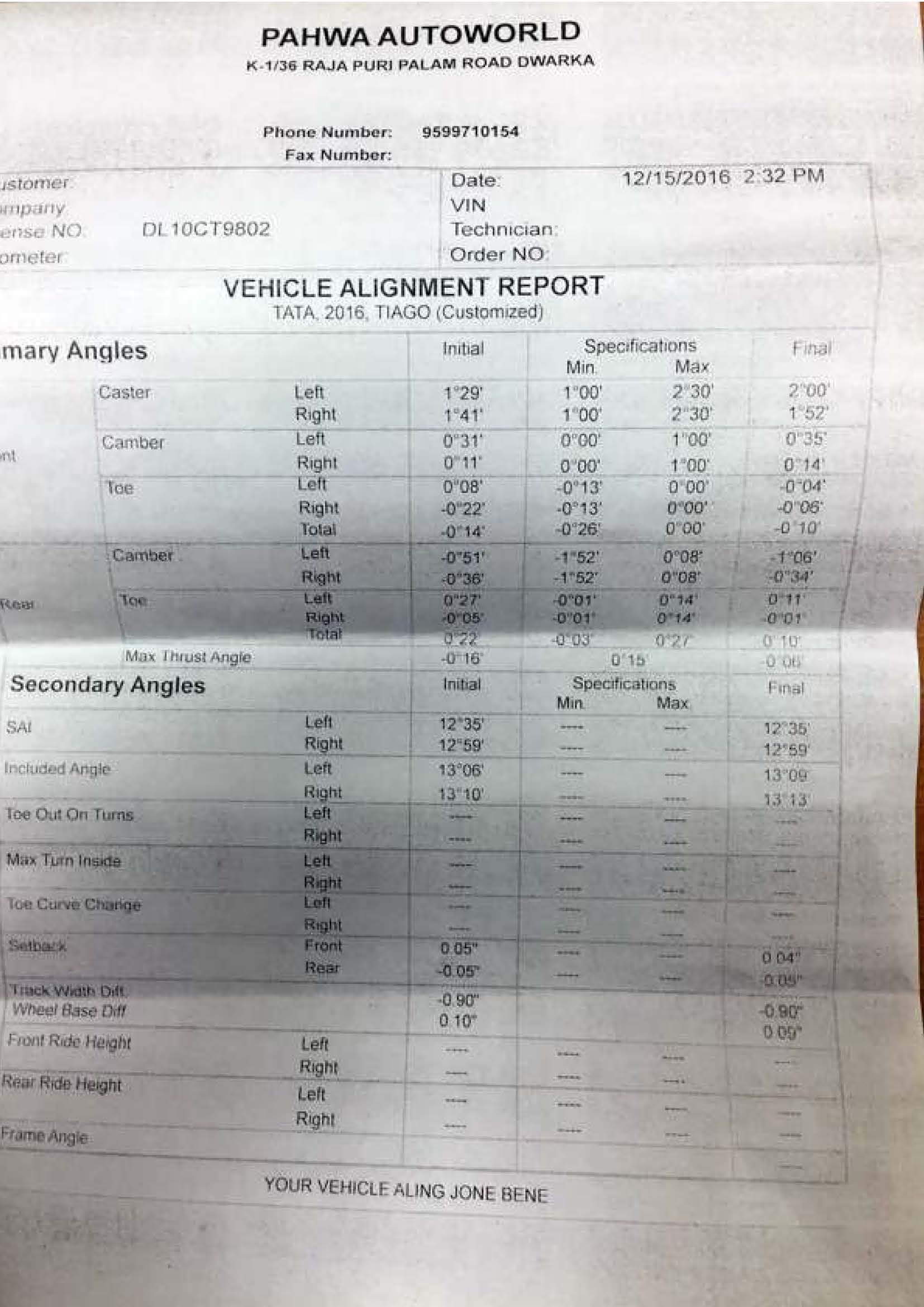 Anyway the vehicle was picked up from my works on 14th dec2016 and delivered the same evening with the attached alignment report which is self explanatory.