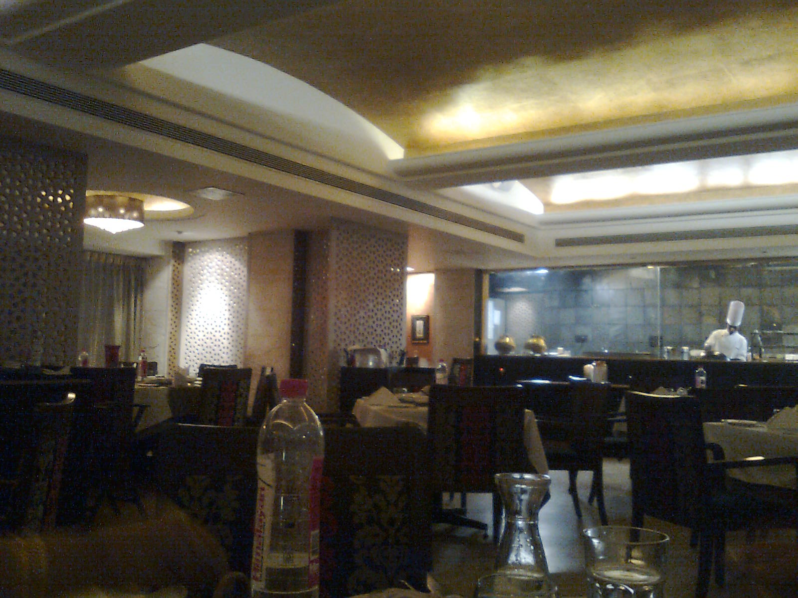 Ambience- High standards made first impressions. While it is adequate for a honourable evening outside, it stops short of 5 star opulence. Gently rolling discreetly lighted beige arches form the ceiling. Patterned doors set with coloured glass squares let you in.Puzzlingly, ordinary floor tiles sadly make the case for some plush carpetting. A clear glass screen lets you see the chefs in the kitchen, but one side of this transparent partition was darkly misted over with fumes from the roasting station. Mirrors and carved glasswork grace one flank while the other has inviting alcoves with elegant chandeliers.The table-chair decor is nominally deluxe- the food will have to lead the rest of the way.
