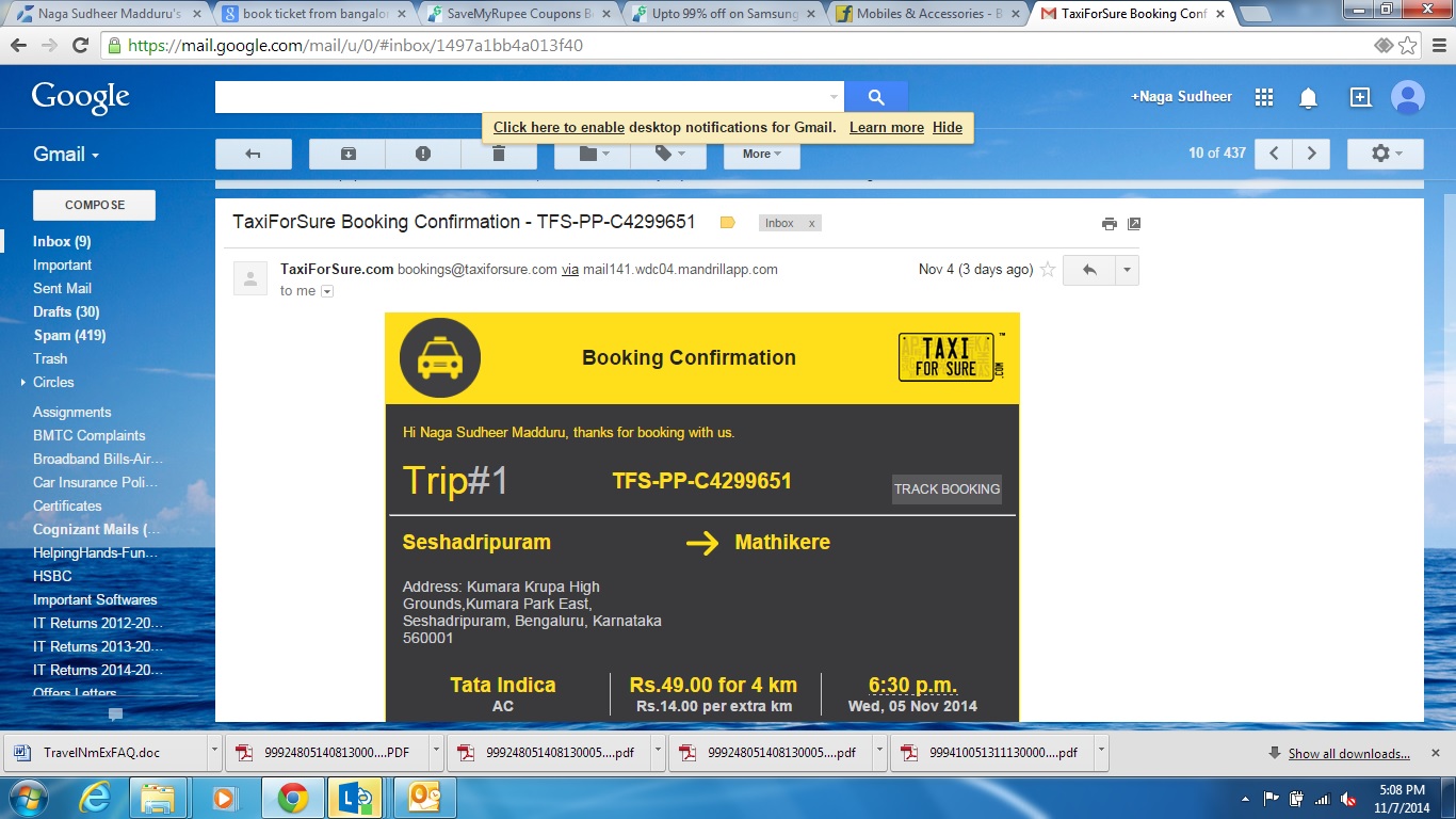 I booked a cab on November 3rd 2014 for November 5th 2014 from Seshadripuram to Mathikere at 6:30 PM in Bangalore. Within half an hour I got the confirmation mail and SMS as enclosed in the attachment.