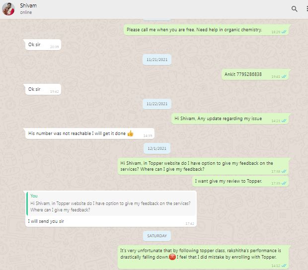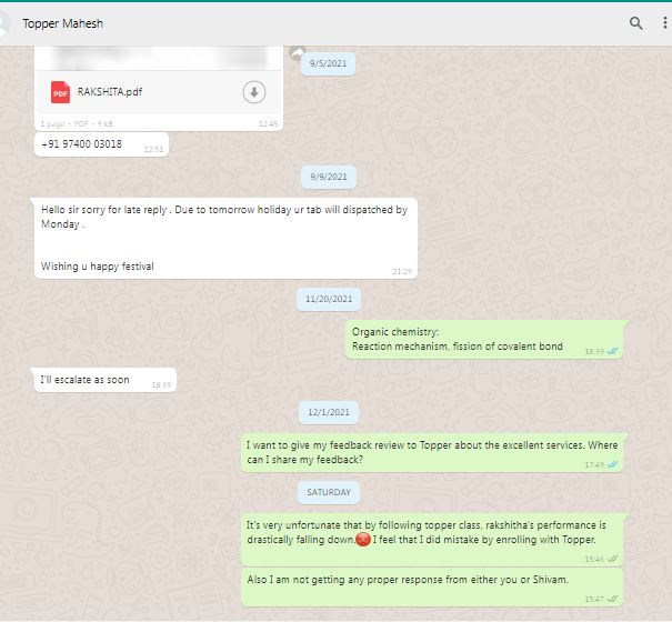 I had Enrolled with Topper for my daughter for JEE and NEET. Initially they promissed me that at any point of time if you feel that Topper is not supporting, we can raise flag and they will resolve the issue or refund.