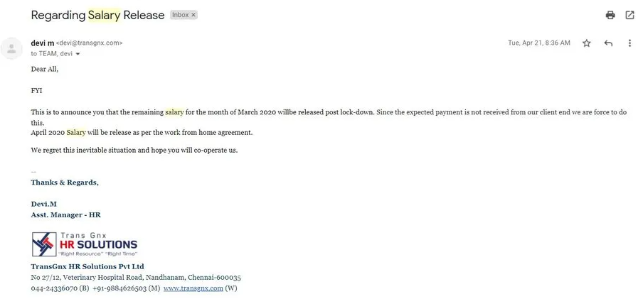 The HR Head Devi sent us the above email stating that they will pay the balance 50% of March Salary after lockdown, but we have not received anything until today.