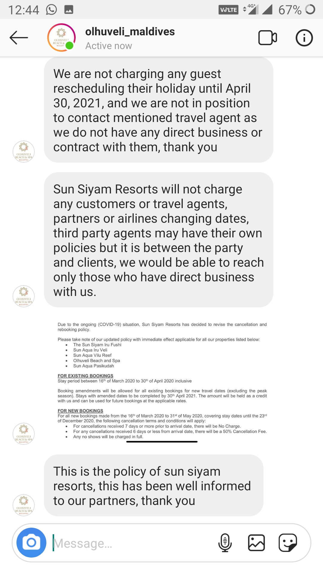 I like to inform you that my trip to Maldives was booked dated April 17th to 21st 2020. Because of Global crisis by corona effect, i requested for cancelling or rescheduling my stay at without charging extra amount. But travel triangle is asking extra 15k amount for rescheduling it to oct 27th - 31st 20202. Though there is a gap of 7 months & even as it's off season, prices of stays will b very less compared to other days.