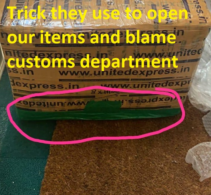 But after receiving the package, I got shocked. Boxes are well wrapped with united express tapes. And in the bottom, there is green tape wrapped on the corners. I felt something fishy. I opened it. All items inside the box are opened and damaged. I'm very sure someone opened each item. Immediately I called them and asked about it. They promised that "UnitedExpress wouldn't open any of the items and we ship the package as we take from your home. May be customs department might sometimes open the package and do some random check."