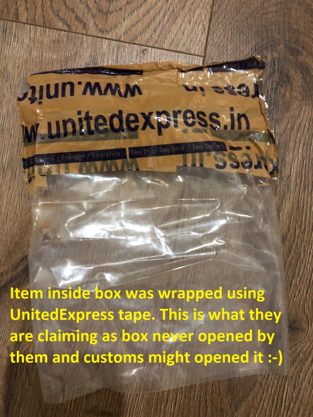 2.If you are so professional in handling packages, why have you changed the thick cardboard box to a thin diaper box? Will the customs department do such things? Changing packages to a different box and they use your UnitedExpress tapes to wrap it. Don't think we are fools to believe this.