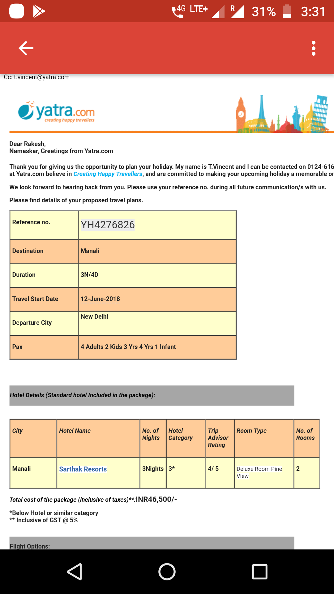 I HV booked my holidays to manali from 13 June 2018 to 16 june 2018 with Yatra.com with booking id YH4276826.
