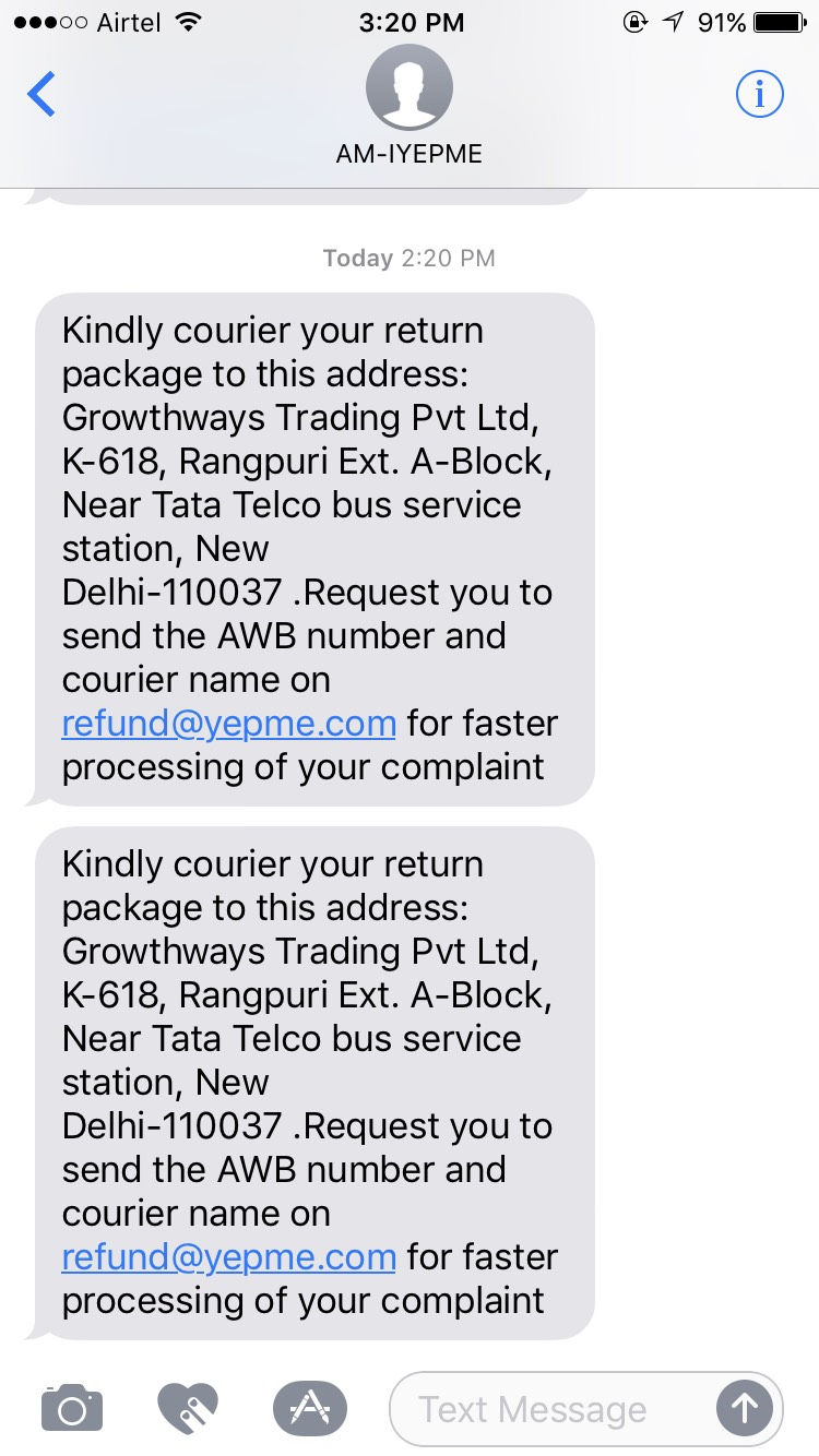 From then on, since the last 5 days(and I don't know till when) I've been getting the same message every 1 hour and my inbox has been flooded with 120 messages of the same god-forsaken "return your package" which I'm now absolutely cannot take. I'm not only going to NEVER again buy from this site, I will delete my account from Yepme.com, block their incoming communications and suggest everyone I know to never buy from this site that has bad products, pathetic customer care service and no regard for customer's concerns.