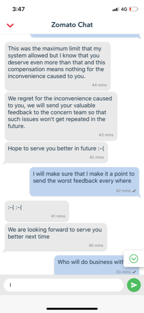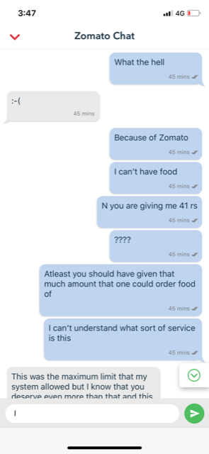On inquiry by zomato team I got to know that the order was delivered to someone else, and the same was also acknowledged by the delivery guy. Further to insult me they gave me an amount of Rs 41 and started sending sad smile [:-(] to frustrate me even more. When I said that I need to order again and I have short cash they said that they cant help as I will only receive money after a week. I requested multiple times but I could not get any help. Please check screenshots.