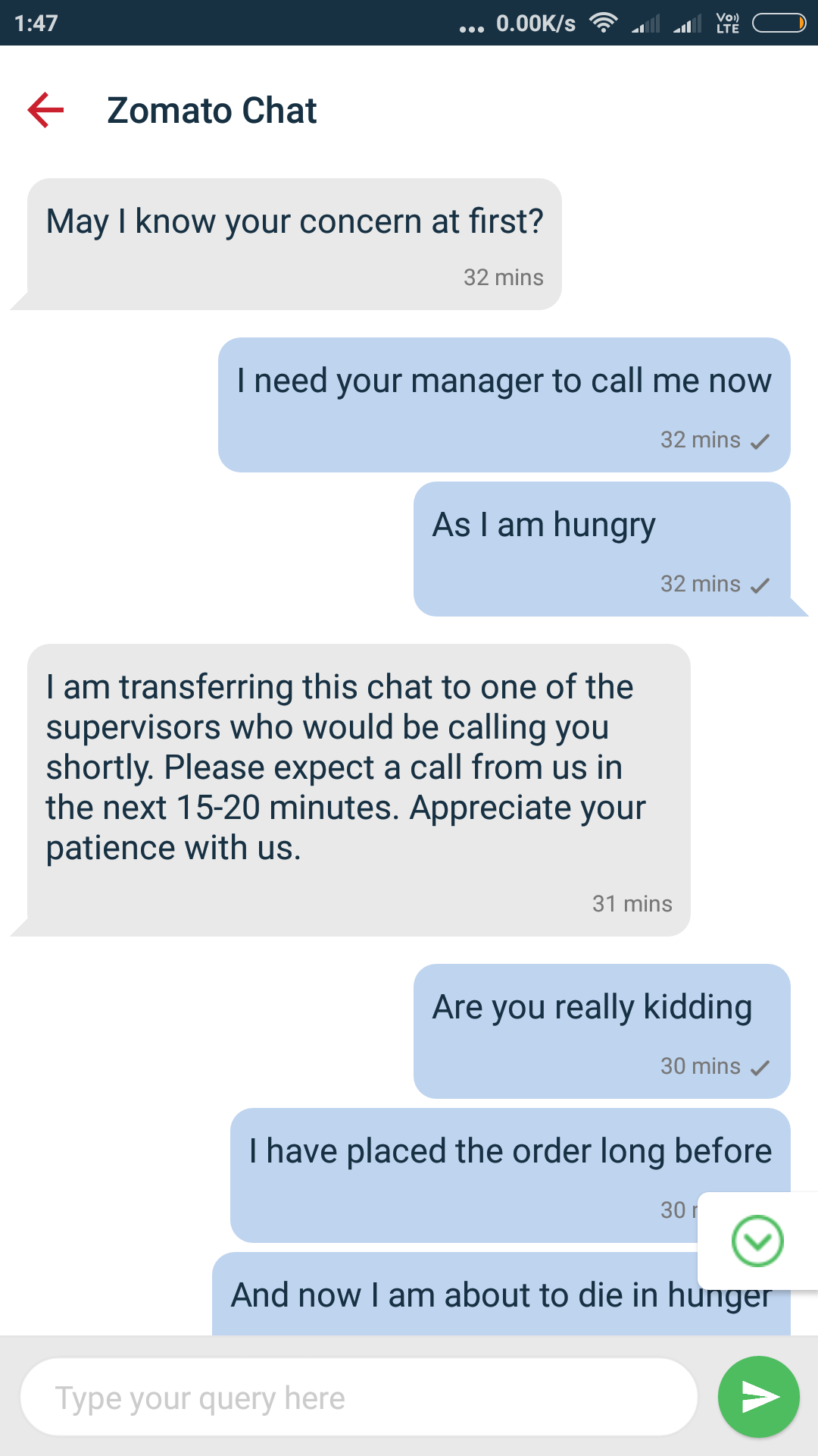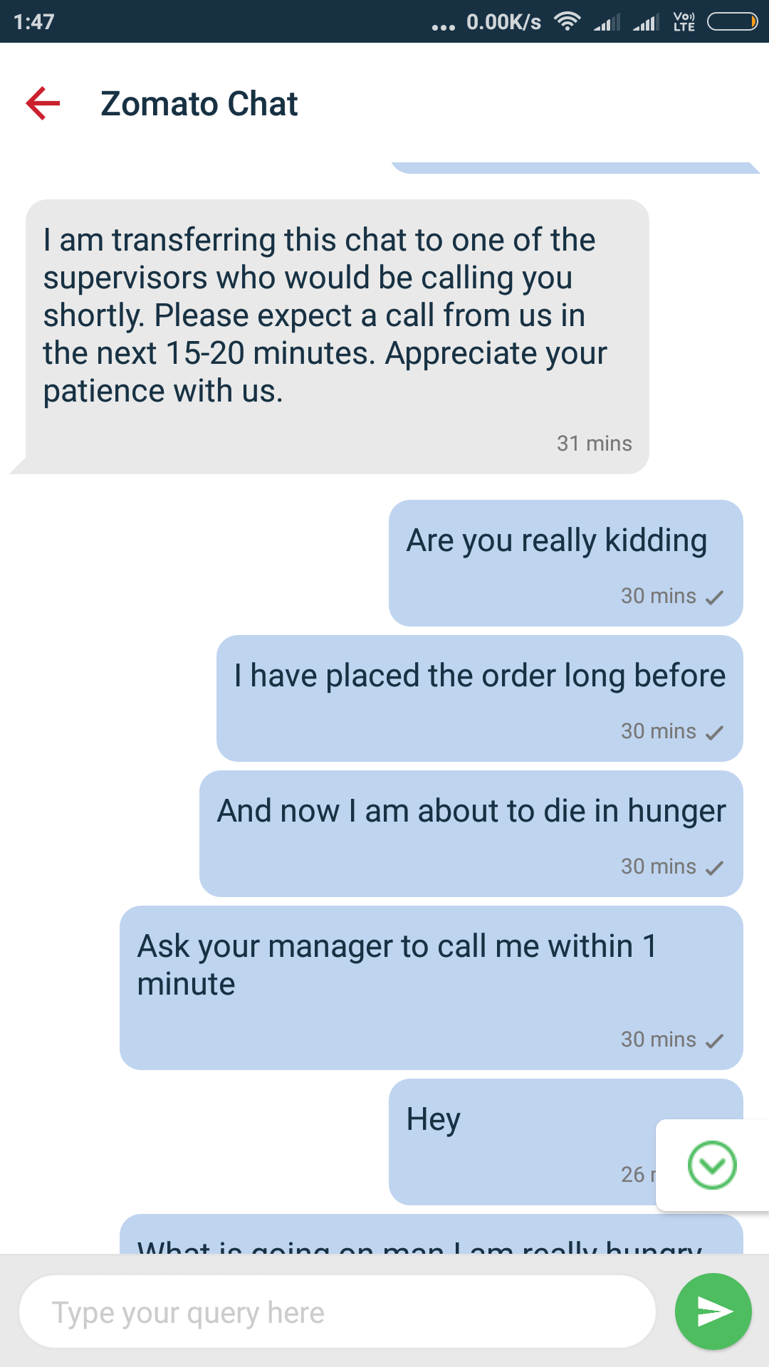 I tried to contact each and every one but my order was not delivered yet. I am dying in hunger now. I ordered chole bhature but when I contacted the restaurant from where my order got placed then they said they received an order of only chole masala and I was charged 160 rs.